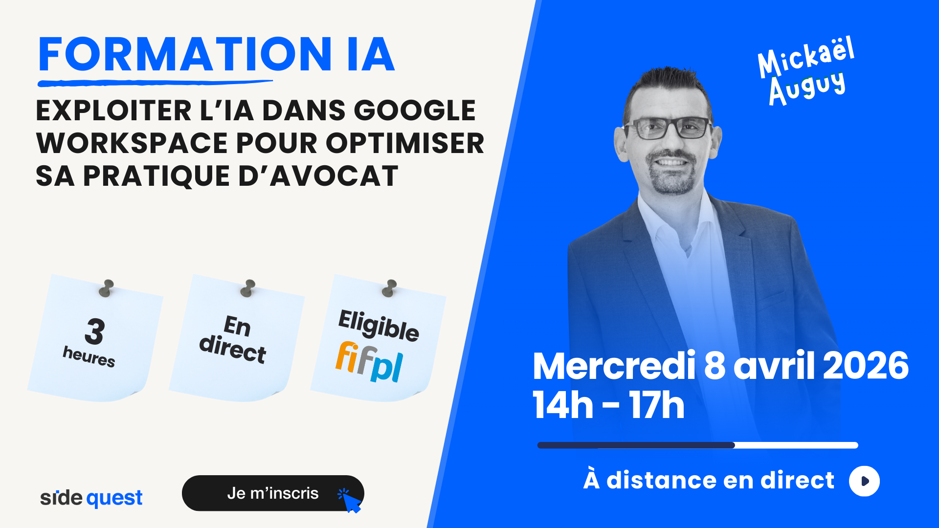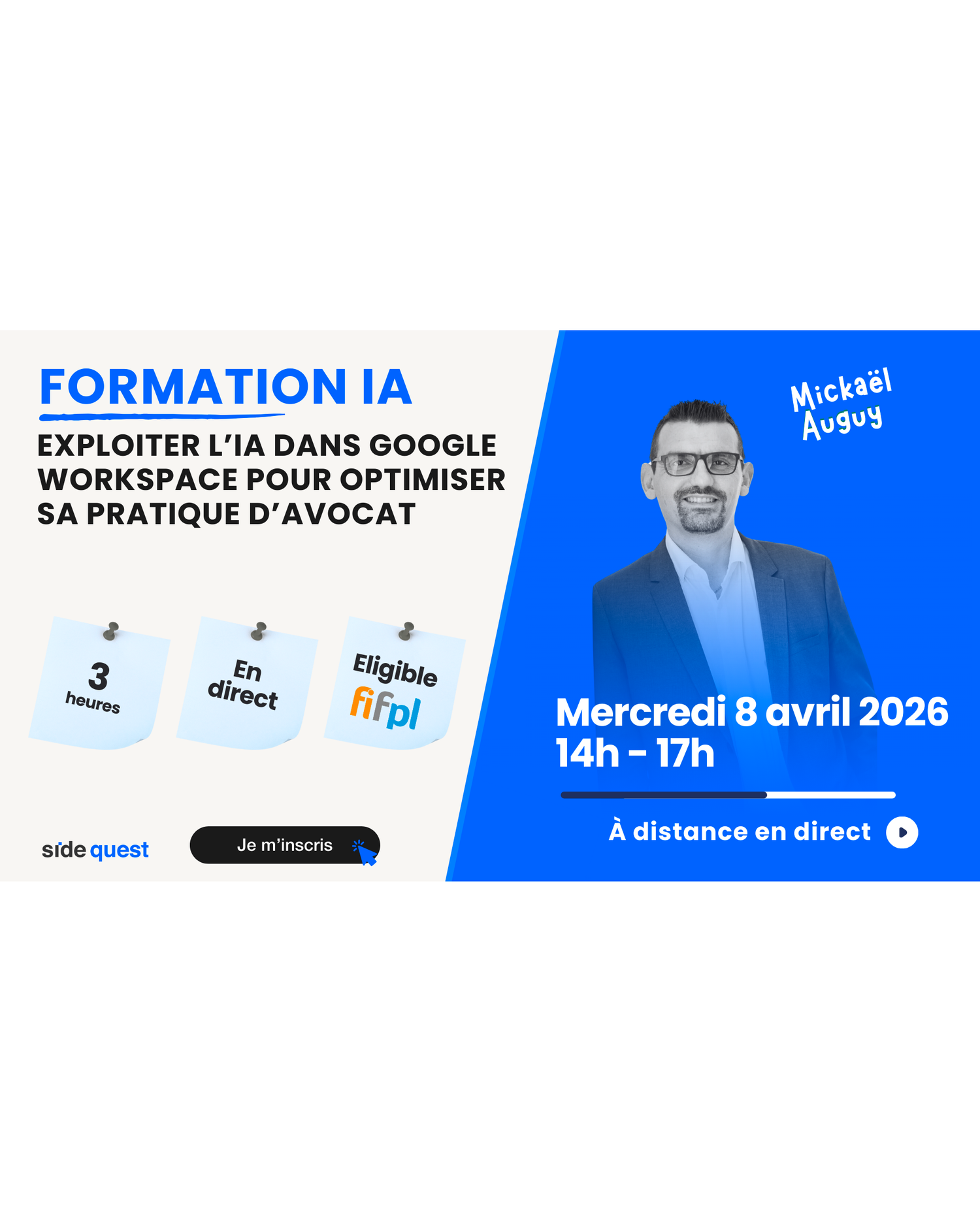 Pour vous en saisir en toute sécurité, nous avons développé un parcours alliant théorie et exercices pratiques basés sur le quotidien des cabinets. Cette formation est animée par Mickael Auguy, formateur expert IA pour avocats.